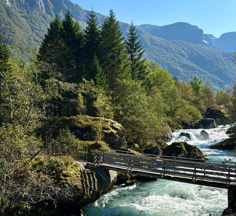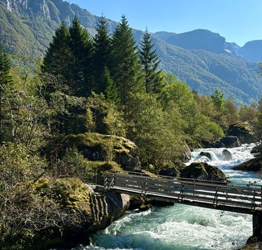 Terminaremos el día visitando esta espectacular cascada doble, donde dos potentes saltos de agua descienden por la montaña y se unen bajo un antiguo puente de piedra, creando una de las imágenes más icónicas del oeste de Noruega.