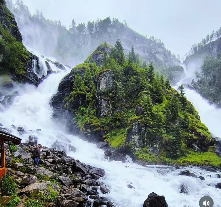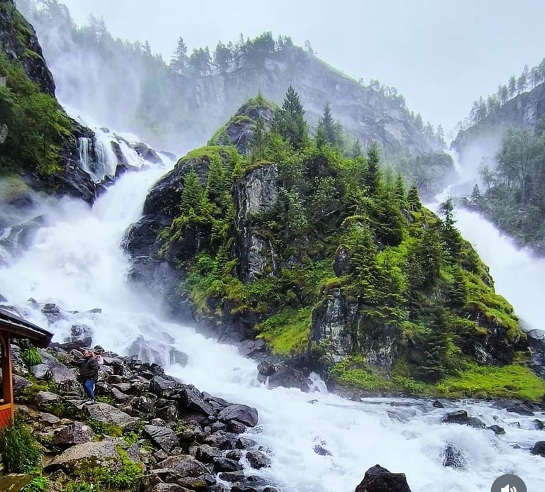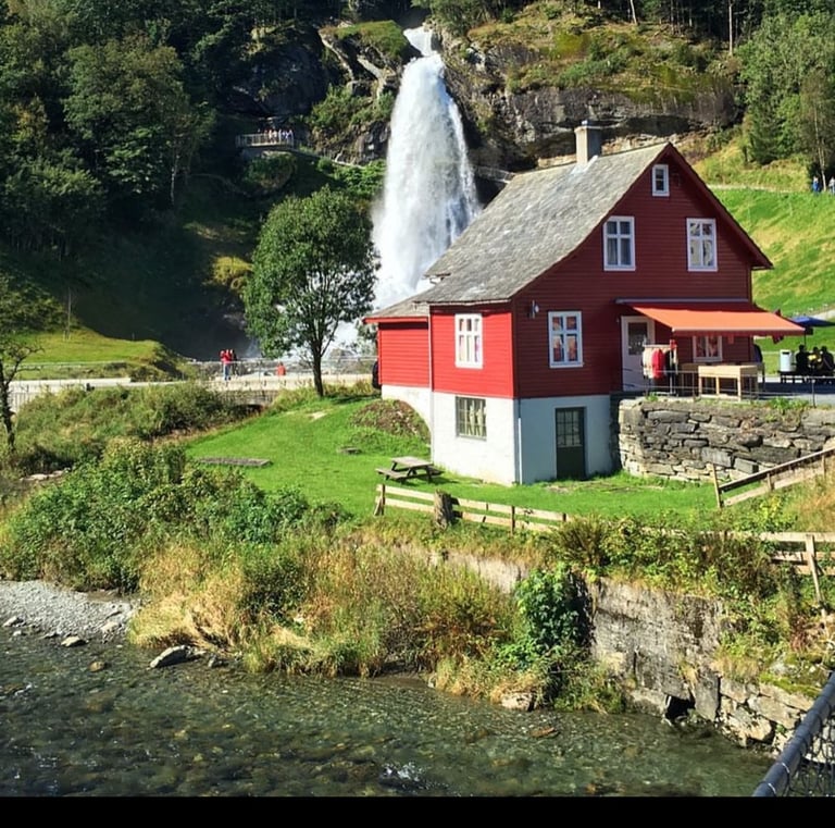 Steinsdalsfossen Una de las cascadas más conocidas de Noruega. Su particular pasarela permite caminar por detrás del agua, ofreciendo una perspectiva diferente y muy especial de la fuerza de la naturaleza